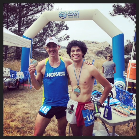 July 14th. Salt Point 26k. After Golden Gate, as stated, I wasn’t planning on racing again until Tahoe Rim Trail 55k on the 21st, but new Pacific Coast Trail Runs RD, Greg Lanctot reached out to me early in the week and invited me to come out to Salt Point State Park on the coast, and experience the new, improved PCTR. I told him I couldn’t do the 50k ’cause I had TRT 55k the next weekend but, after some thought, said what the hell and told him I’d come run the 26k. I hadn’t raced out at Salt Point since 2011, when Leigh Schmitt left me for dead in the 50k there. I’d been trying to have my cake and eat it too with regards to straddling two sports, ineffectively I might add—long-course triathlon and ultrarunning. I was just coming off Full Vineman, looking ahead to Ironman Hawaii in October, and thought I had this 50k in the bag until I met Leigh out on the trail, for the first time that day, and discovered he was the real deal. We’d end up training together for a while before he’d pack up the family and move to the Bahamas, of all places!, where he still teaches with his wife there, at The Island School. Hard to believe it’s been seven years since we’d raced each other out there. Time goes by like course ribbons in a 26k!