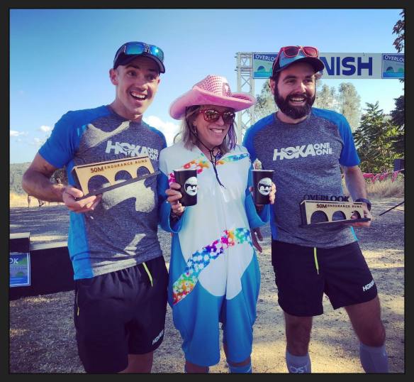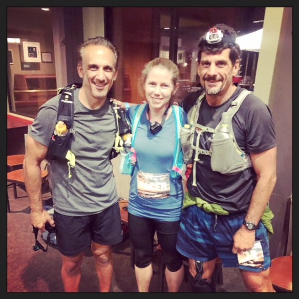 With a double-fisting Ann Trason and Chris Denucci at the finish line of the inaugural Overlook 50mi back on 9/29. Ann’s dog paced for a while, then got bored and dropped us!