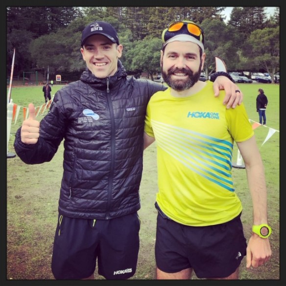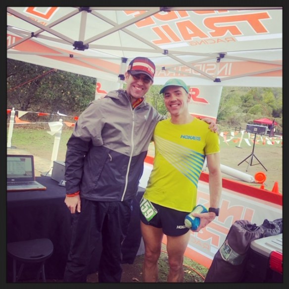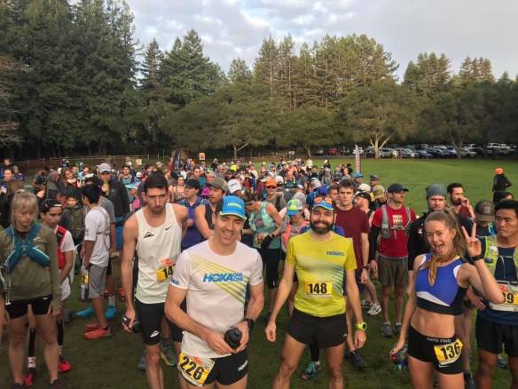 Parting shot: the start of the Woodside 50k. Second podium finish in December. My last race representing Hoka One One. Chris and I stand between the runners who will put up new course-records for the guys and gals. Photo Credit: Doc Tanaka