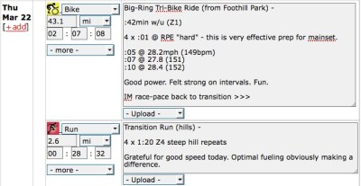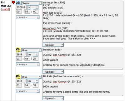 Here’s my spring break triathlon training week. Just click on the pics to make ’em bigger.