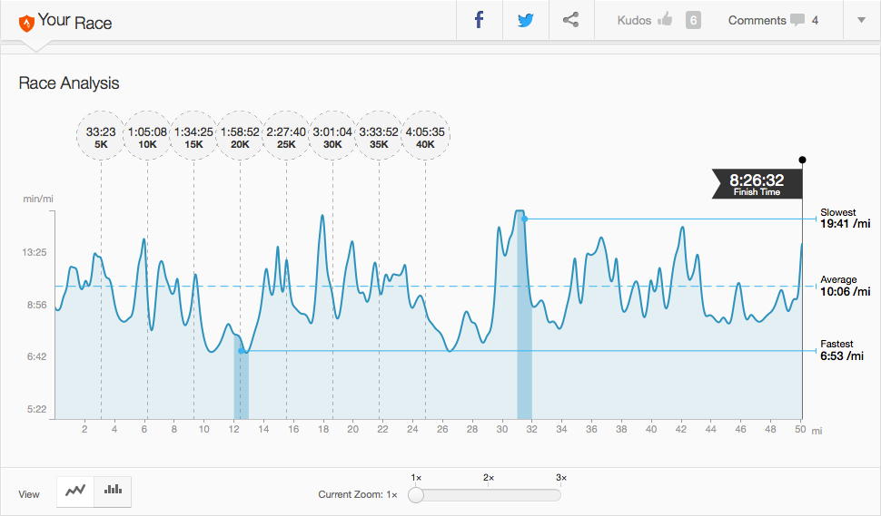 Results. First half in 8:27 (10:06/mi). Second half in 9:35 (11:26/mi). I came up short on the CR but reached my goal of running the second half of the event 14% or better. I was 11.8% slower over the second 50. That’s for you Gary Gellin!! Thank you.