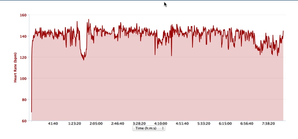 Like 2013, I geeked out on some spreadsheet scenarios, which would give my race some structure. Because the course-record was 17:47, I wanted to give myself some cushion, so I finally settled on a target race time of 17:20. After running the 50mi course during the training runs in June in about 8:30, I figured running the first half, on fresh, race-day legs, in about 8:10, seemed pretty reasonable (as long as I was at 140 beats/minute, +/- two beats). I also estimated that if I could run about 8:10 over the first loop, then I’d plan on the inevitable slowing to be no more than 12-15% over the second half.