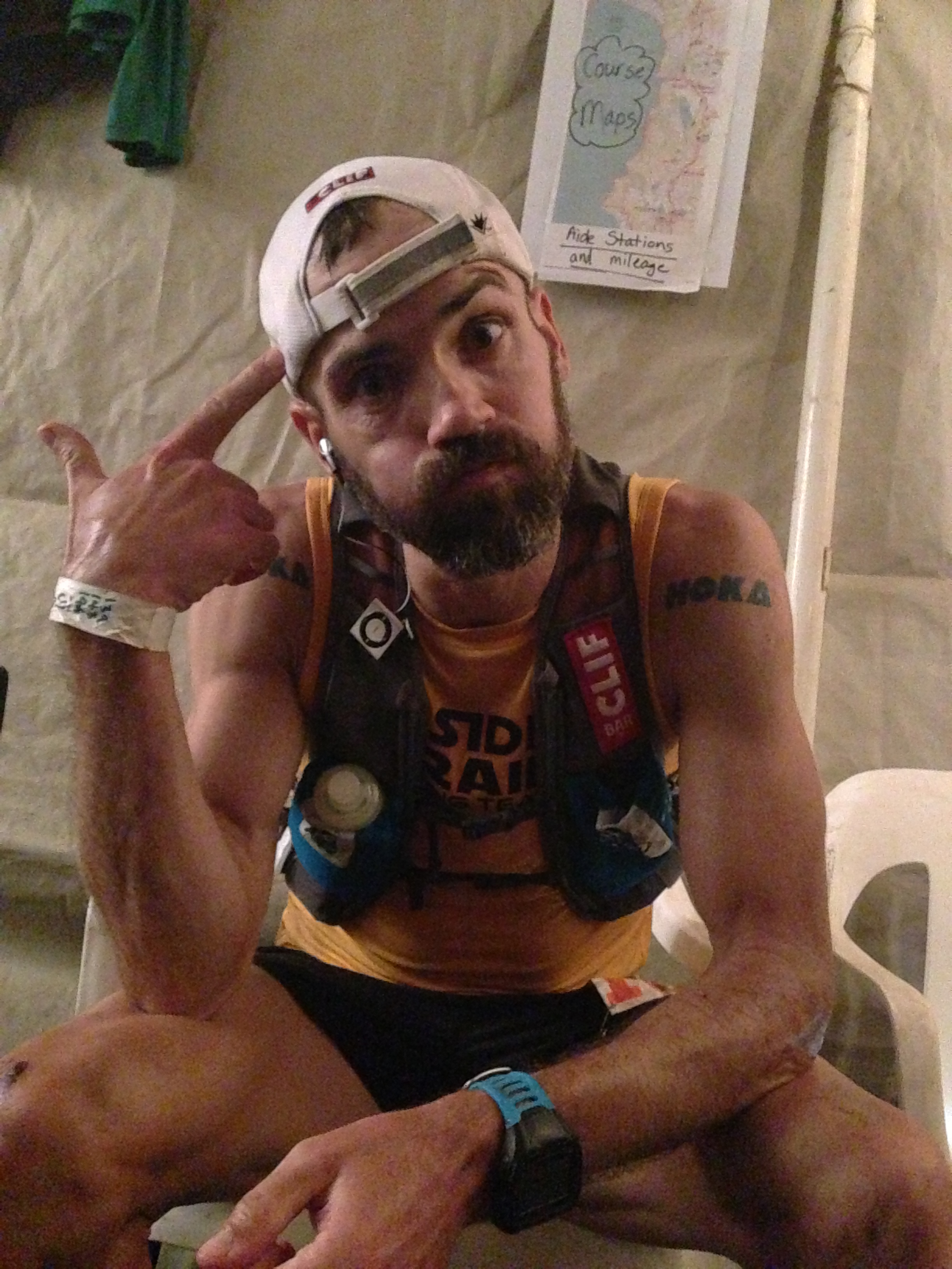 I probably should have just stuck with what worked all day but I started taking soda at mi80 and then hit the Coke at aid-stations from there. Stomach wasn’t havin’ it. And as Chris caught up to me just out of Hobart, he found me bent over, retching in the bushes. Everything came up. And here it was, the third unknown of the day. Deal with it. Don’t be a cupcake. I remembered an athlete I coached to Western States this year, Todd Bertolone. He had more than is his share of nausea and vomiting at States. I thought of him, and got my *ss moving again. Todd had his goals at Western, and met them. “Feelin’ good. Lookin’ good…”