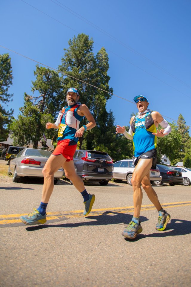 Rolling through Foresthill, mile 62. In sync with pacer, Louis Secreto. — Photo credit: Bob MacGillivray, Drymax Socks