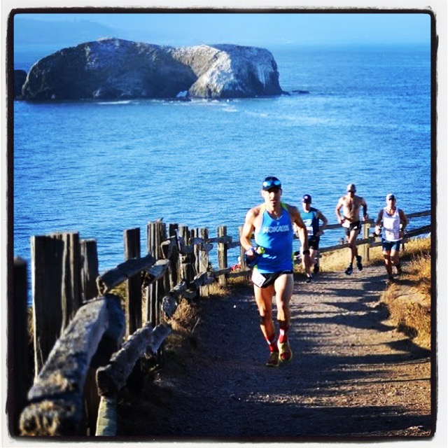 Healdsburg Running Company’s, Luis Quezadas, 19, would be my primary competition and he led us out. I bashed my head into a downed tree trunk, saw a few sparks in my field of vision and kept cranking. Gawd. I’d decided to wear the 7oz HOKA ONE ONE, EVO Jawsfor this race, and even did a fun, 4:40 downhill mile the evening before to really prime my legs for some aggressive downhill running out at Salt Point the next morning. As was the case back in 2011, experience paid off, and the veteran moved in to 1st on the early climb up the ridge. I kept my foot on the gas around the first loop, across Route 1, onto the bluffs overlooking the Pacific Ocean, then back out to crank out the second, shorter loop of the 26k, back across Route 1, onto the bluffs, to the finish. Stunning views!