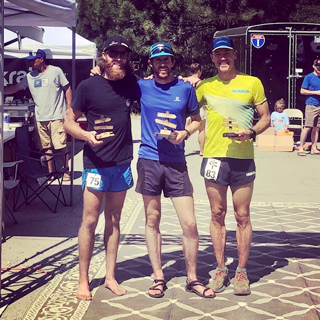 Two young guys went with me and we’d dice it up for a quite while before I’d work to pull away in the final miles of the race. It was a super fun event and exactly what I needed to clear my head after Western States. Cruising on the road into the finish line, I end up snagging the win and lowered the 2012 course-record by four minutes (7:28/mi pace!). 2nd place, Terence Hurley (31), also went under the old CR, now on a slightly harder, longer course. And 3rd place, David Elk (22), missed the CR by only a couple seconds. This is the power of competition. We pushed each other so hard out there and because of it we all ran at—or damn close to—our full potential that day. So fun.
